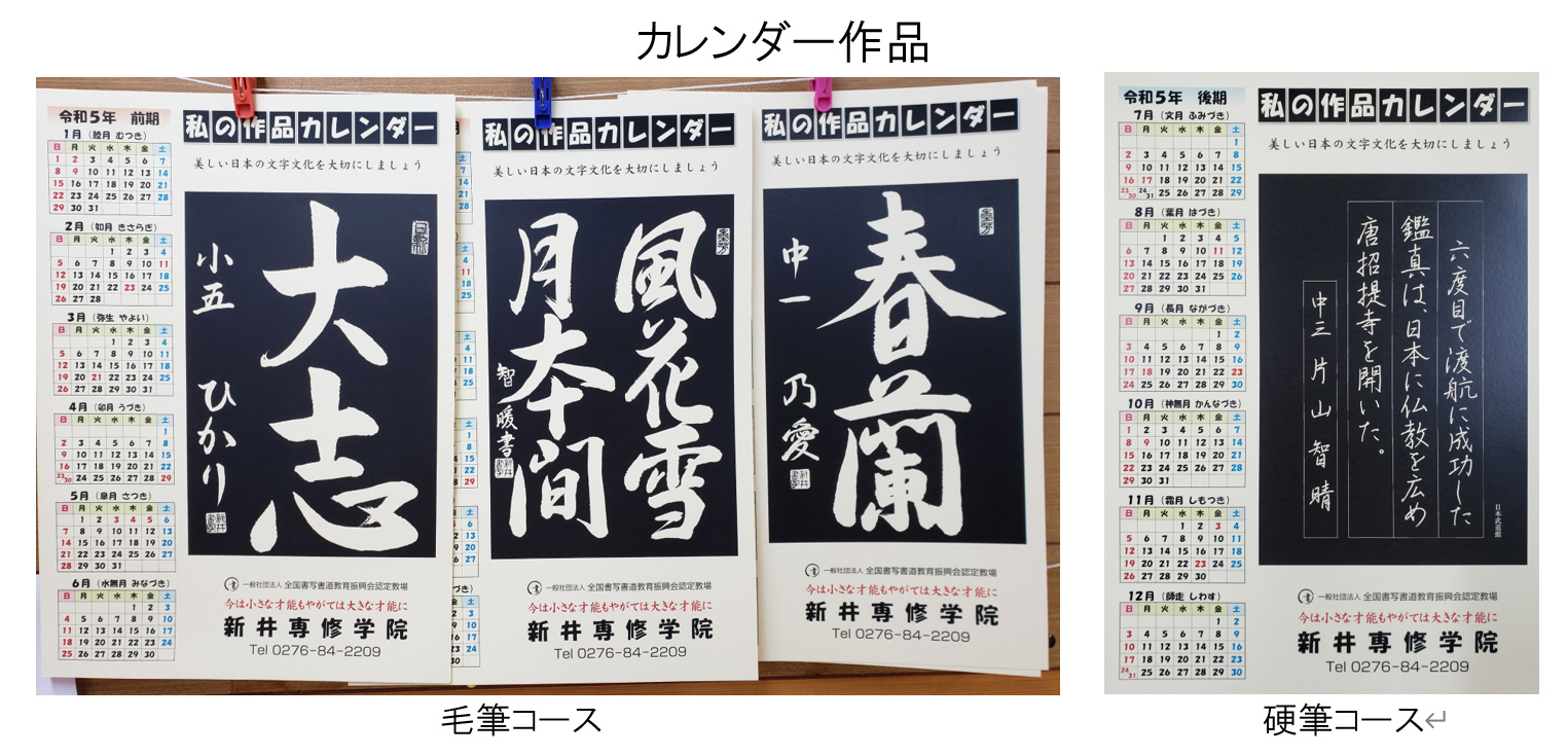 - 毛筆半紙検定試験課題を進めるほか、各大会への作品出品、全国大会への出場、大会特別特訓、カレンダー作品制作などに取り組みます。